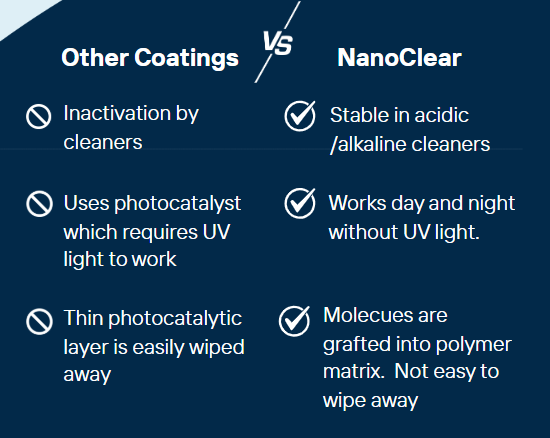 NanoClearA transparent, long-lasting coating that kills 99.9% of bacteria and viruses.